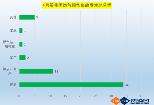 2017年4月發(fā)生在居民家中的燃氣爆炸事故為34起,飯店、商戶(hù)發(fā)生11起,較3月份略有減少。