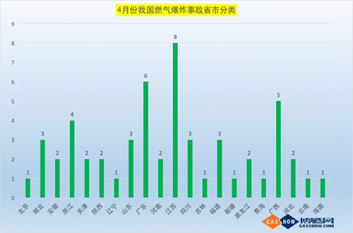2017年4月發(fā)生燃氣爆炸事故前8位省份依次為江蘇?。?起)、廣東?。?起)、廣西?。?起)、浙江?。?起)、湖北?。?起)、山東?。?起)、四川?。?起)、福建?。?起)。